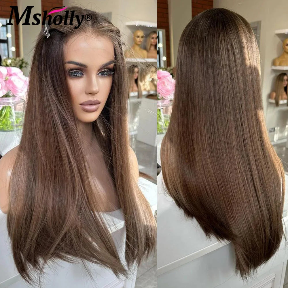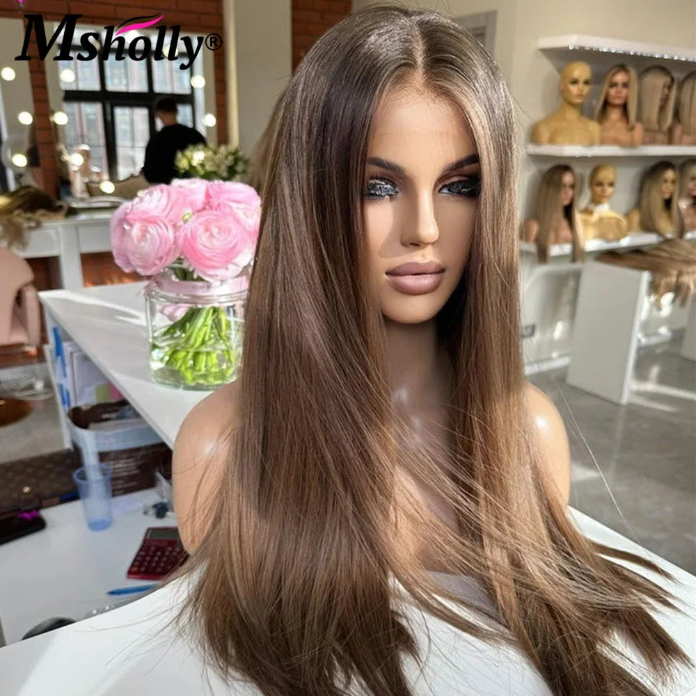 Highlight Chocolate Brown 13×4 Lace Front Wigs Human Hair Bone Straight Preplucked Human Hair Wig Brazilian Colored Remy Wigs